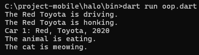 Kode program berikut ini merupakan contoh konsep penerapan OOP pada Bahasa Dart. Buat file baru pada folder bin dengan nama oop.dart dan tambahkan kode program berikut.