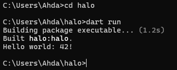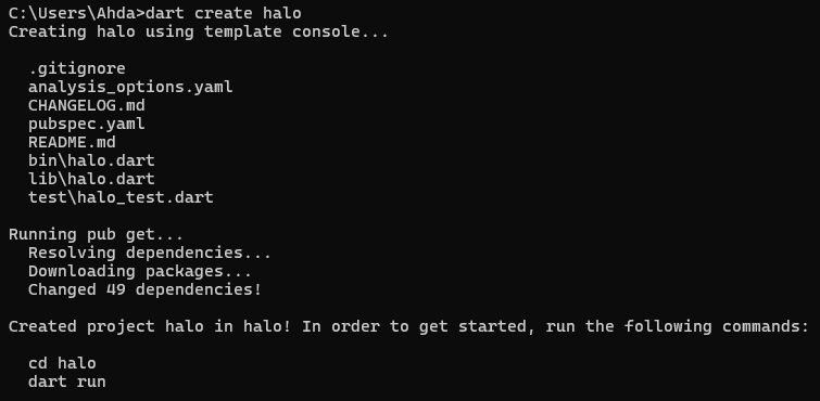 dart create halo maka proyek dart pertama dengan nama halo akan terbentuk.