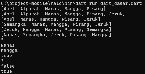 List<String> fruits = ['Apel', 'Alpukat', 'Nanas', 'Mangga', 'Pisang'];