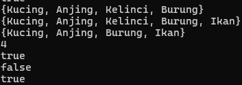 Set<String> animals = {'Kucing', 'Anjing', 'Kelinci', 'Burung'};